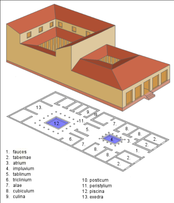 Intrarea se făcuea printr-un vestibul mic (fauces) , care conducea spre curtea interioară (atrium) ce avea în centru un impluvium (bazin în care se colecta apa de ploaie scursă de pe acoperișul galeriei acoperite)